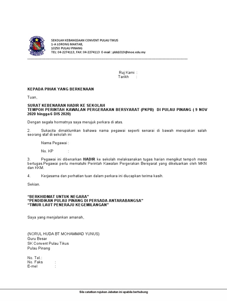 Proses kemasukan & kuarantin pus yang tiba dari luar negara. Jika anda perlu hadir ke pejabat atau merentas daerah/negeri ketika pkp/pkpb kerana urusan penting, disini kami sediakan contoh surat pelepasan bekerja pkpb / pkp & borang permit rentas negeri untuk rujukan. Lembaga kenaf dan tembakau negara, kubang kerian, 16150 kota bharu, kelantan darul naim. Apr 24, 2020 · boeh juga rujuk surat kebenaran bekerja semasa pkpb contoh borang rentas daerah disini kami juga serta contoh borang rentas daerah yang disedikan oleh polis diraja malaysia (pdrm) untuk urusan rentas/keluar daerah bagi tujuan kecemasan. Kawasan pkpb aktiviti pekerjaan aktiviti pekerjaan berdasarkan pekeliling/arahan jpa atau/dan surat arahan/pekeliling yang dikeluarkan oleh setiausaha persekutuan sarawak/setiausaha kerajaan negeri sarawak bagi penjawat awam.
